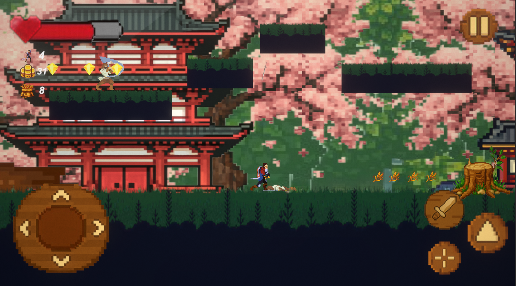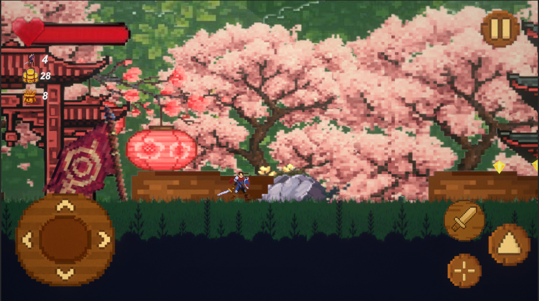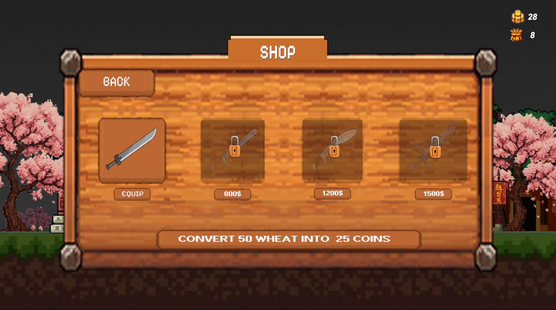 A 2D platformer featuring combat, enemy encounters, Chinese-themed UI, and an in-game shop for sword upgrades using virtual currency.
